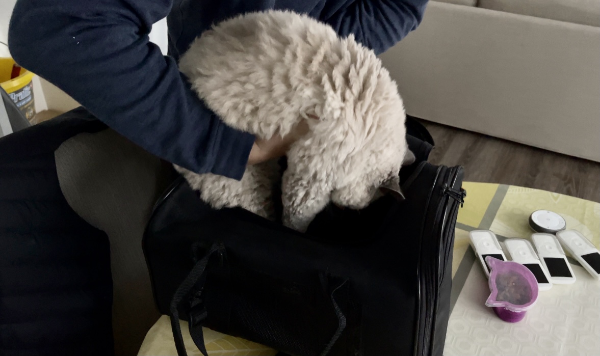 “수의사를 보자마자 무스카델이 겁먹었는지 나한테 와서 안긴거 있지! 그냥 파고들기만 한게 아니고 내 가슴위로 자꾸 기어올라오길래 내가 안고 있었어.”
