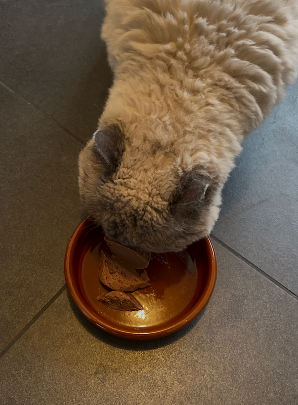 캔을 따서 그릇에 덜어 주었더니 덩어리를 핥기만 했다. 숟가락으로 으깨서 다시주니 금새 클리어했다.