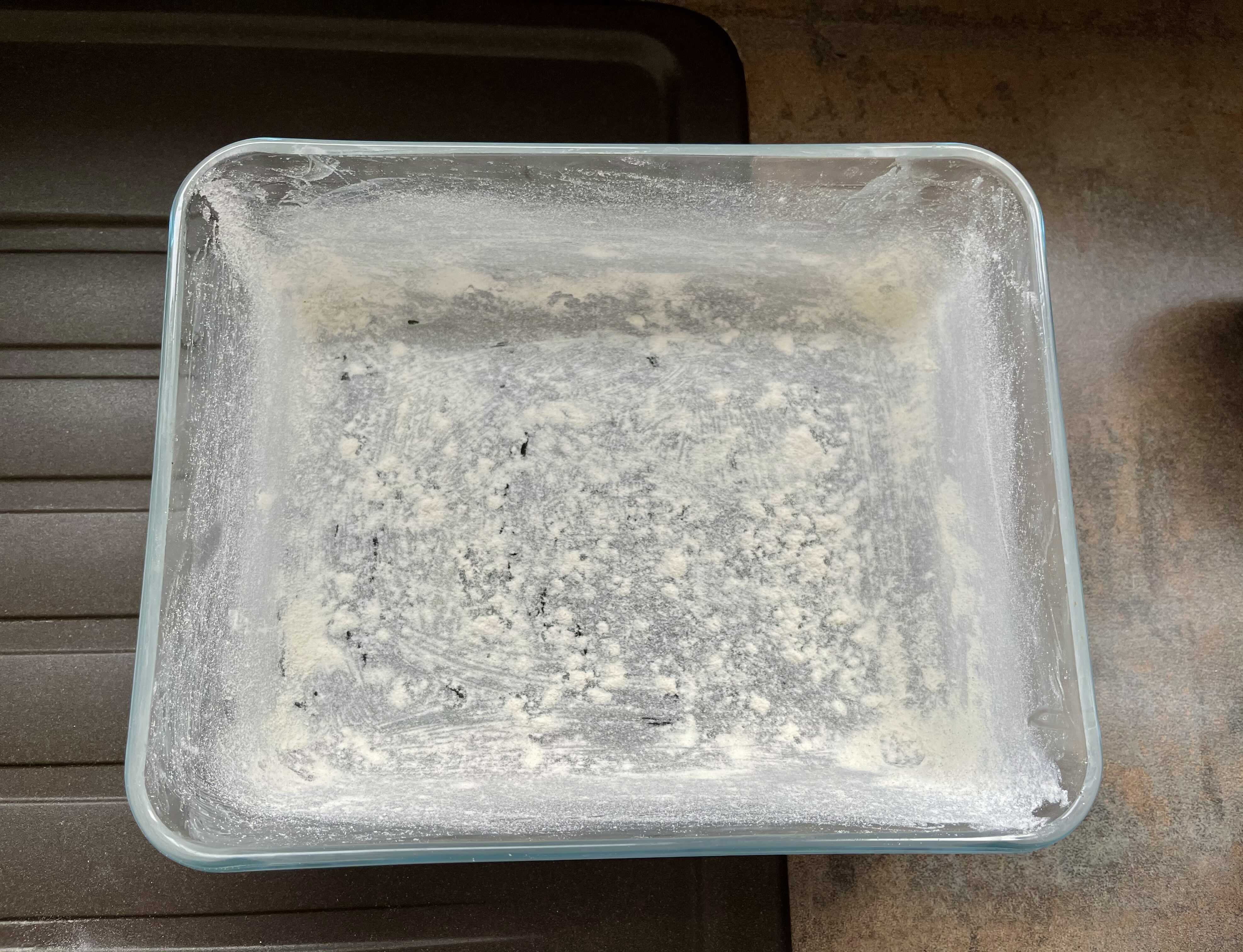 2. 케잌틀에 녹인 버터를 꼼꼼히 바른 후 그위에 밀가루를 크게 한숟가락 올린 후 이리저리 굴려서 2중 코팅을 해 준다.