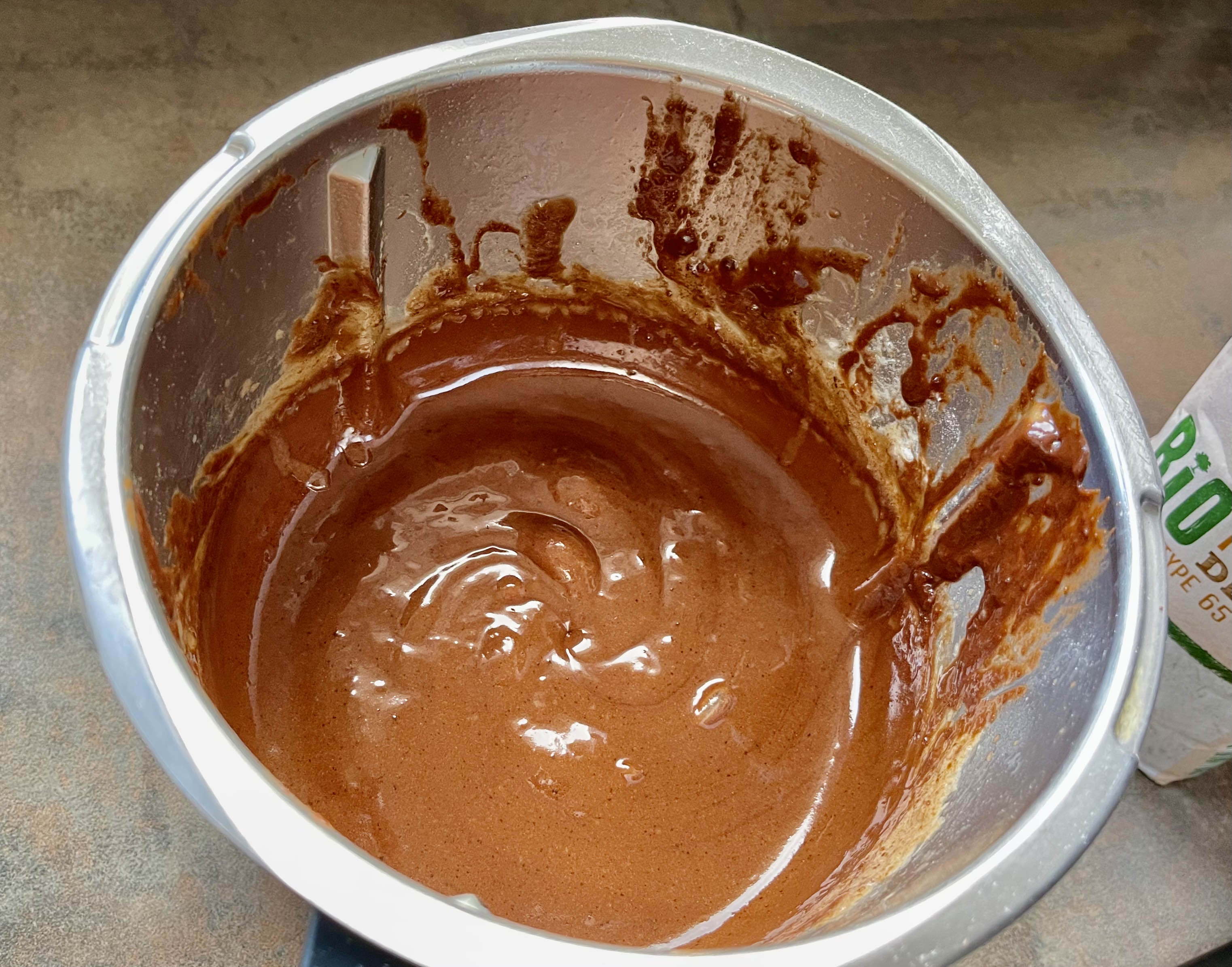 3. 볼에 설탕, 버터, 초콜렛을 넣고 모두 녹아서 퐁듀가 될 정도로 녹여준다. (써머믹스에서는 60도로 6분간 녹입니다. 써머믹스가 없다면 안전하게 중탕으로 녹이는걸 추천합니다!)