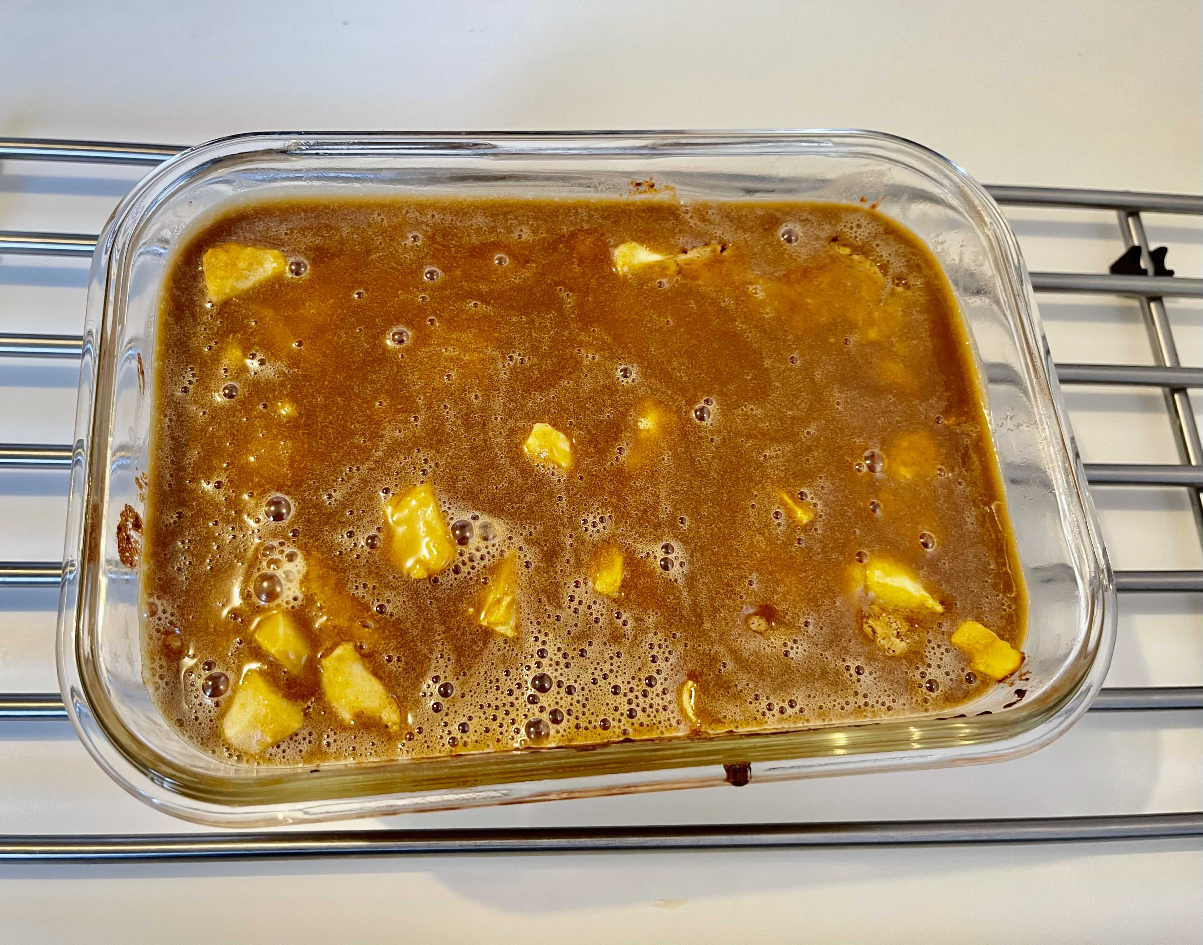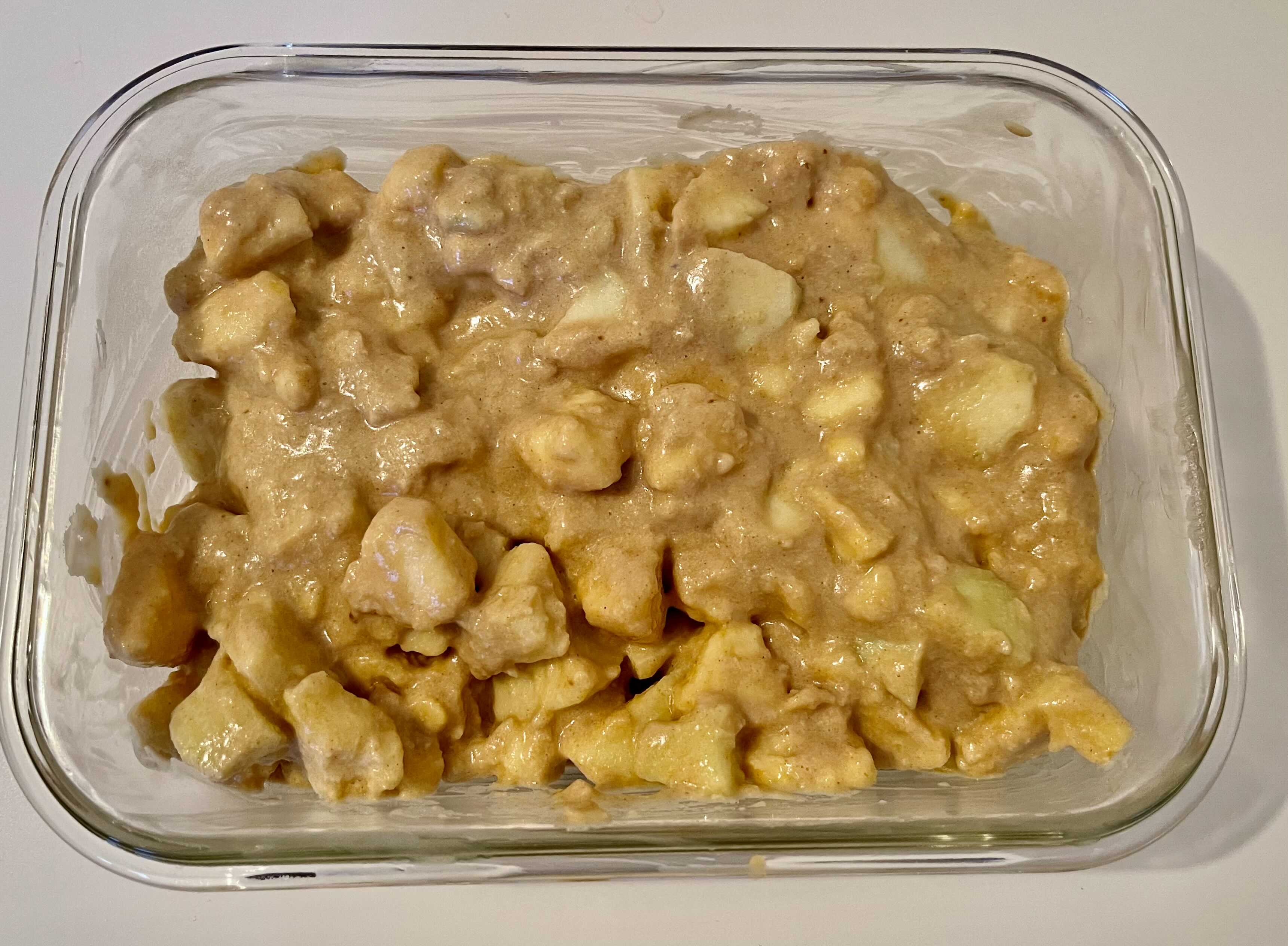 5. 조각낸 사과들을 반죽에 넣고 버무려준 후 버터를 발라둔 용기에 담습니다.