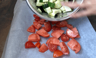 3. 오븐틀위에 종이호일을 깔고 그위에 야채를 올립니다.