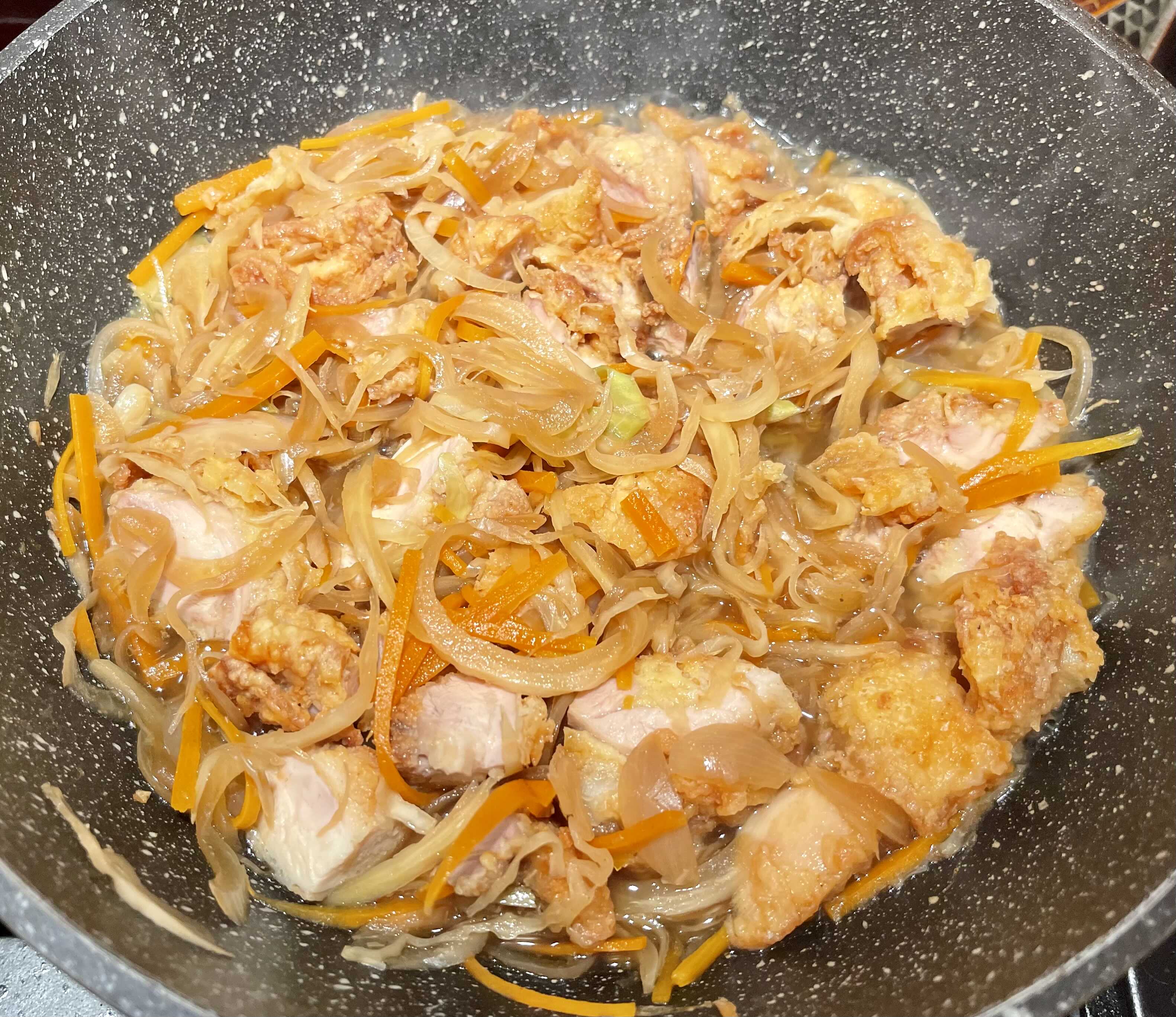 만드는건 매우 간단하다. 야채들을 맨 밑에 깔고 그위에 자른 순살 치킨 조각들을 얹고 간장 양념 부어서 중불로 끓이다가 계란물 붓고 가스렌지 불 끄고 두껑 덮어놓고 남은 열로 계란을 익히는게 끝-