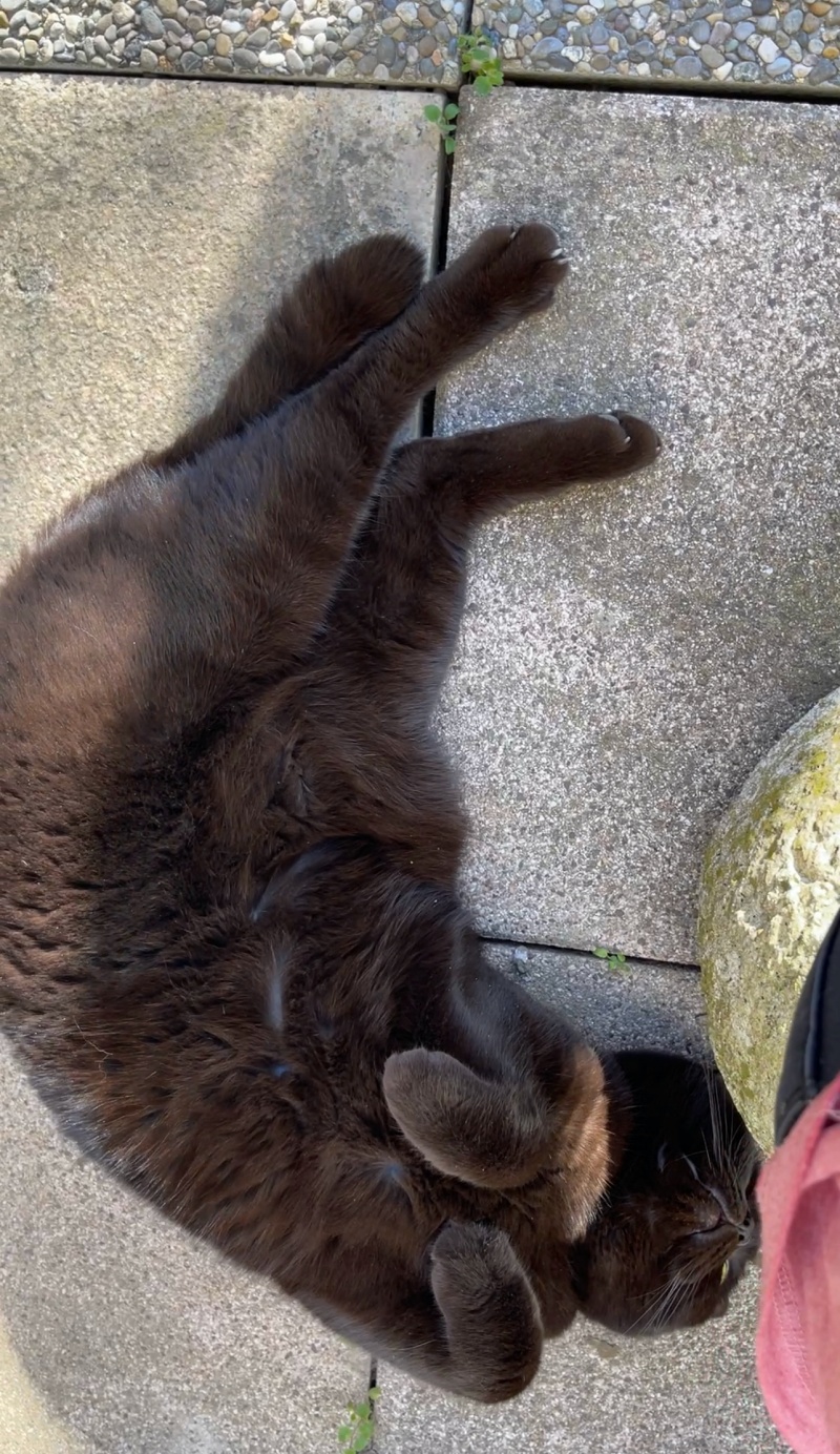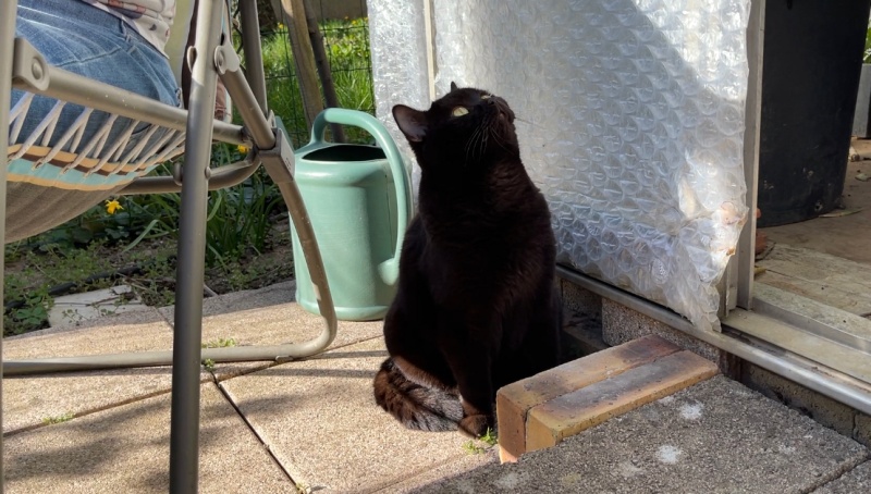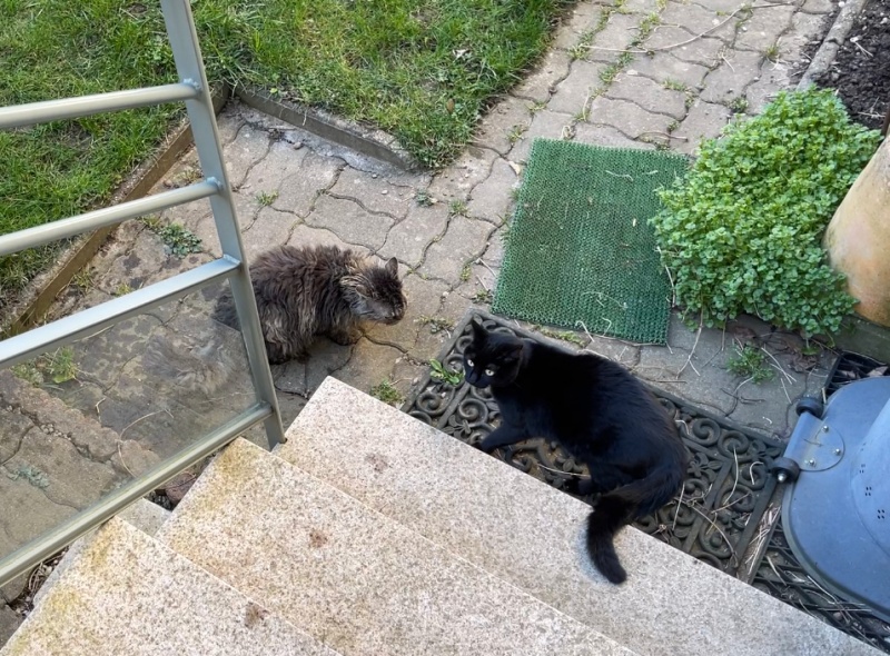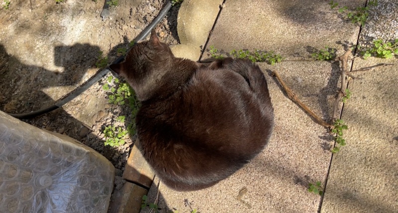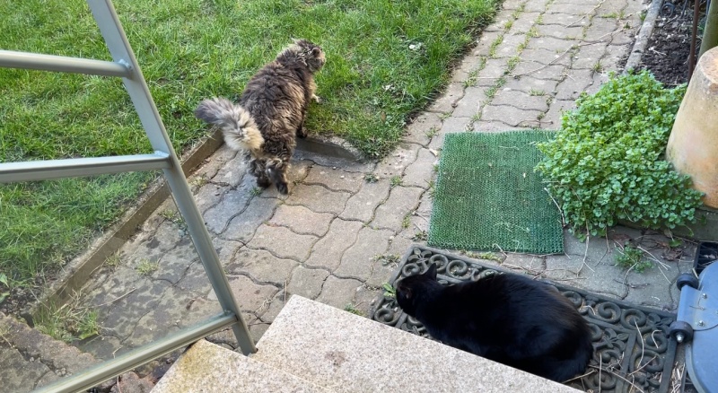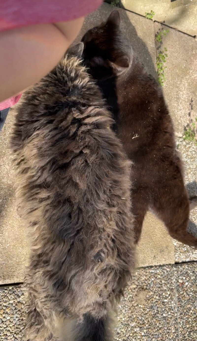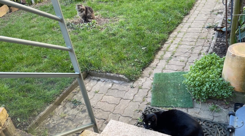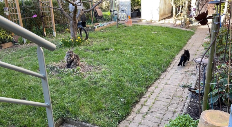 시댁 정원에서 시어머니와 콜라를 마시며 일광욕을 하고 있을때 고양이들은 내 뒷자리를 차지하기 위해 다투었다.