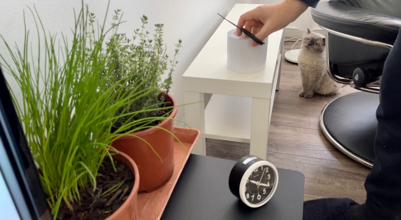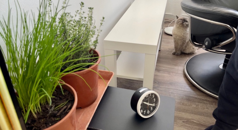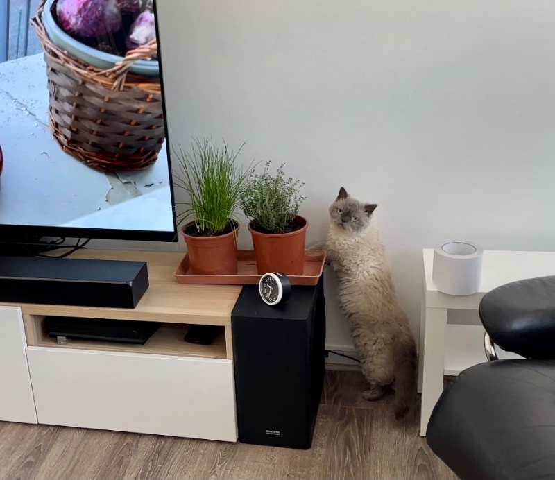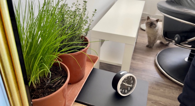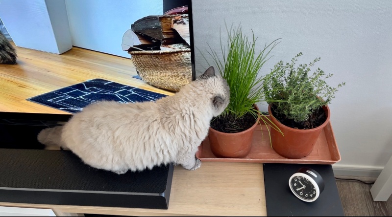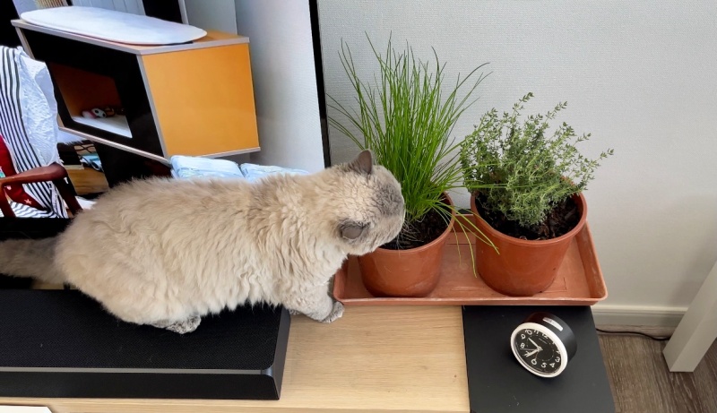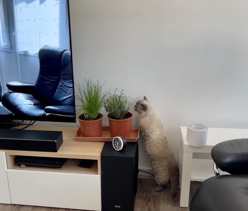 아침에 무스카델이 양면테이프를 발견하고는 화분에 다가가지 못해 이리저리 궁리를 하는 모습이 보였다. (타임 화분에는 관심이 제로다.)