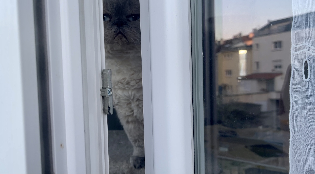 발코니 문틈으로 무스카델이 빼꼼이 보고 서있다.