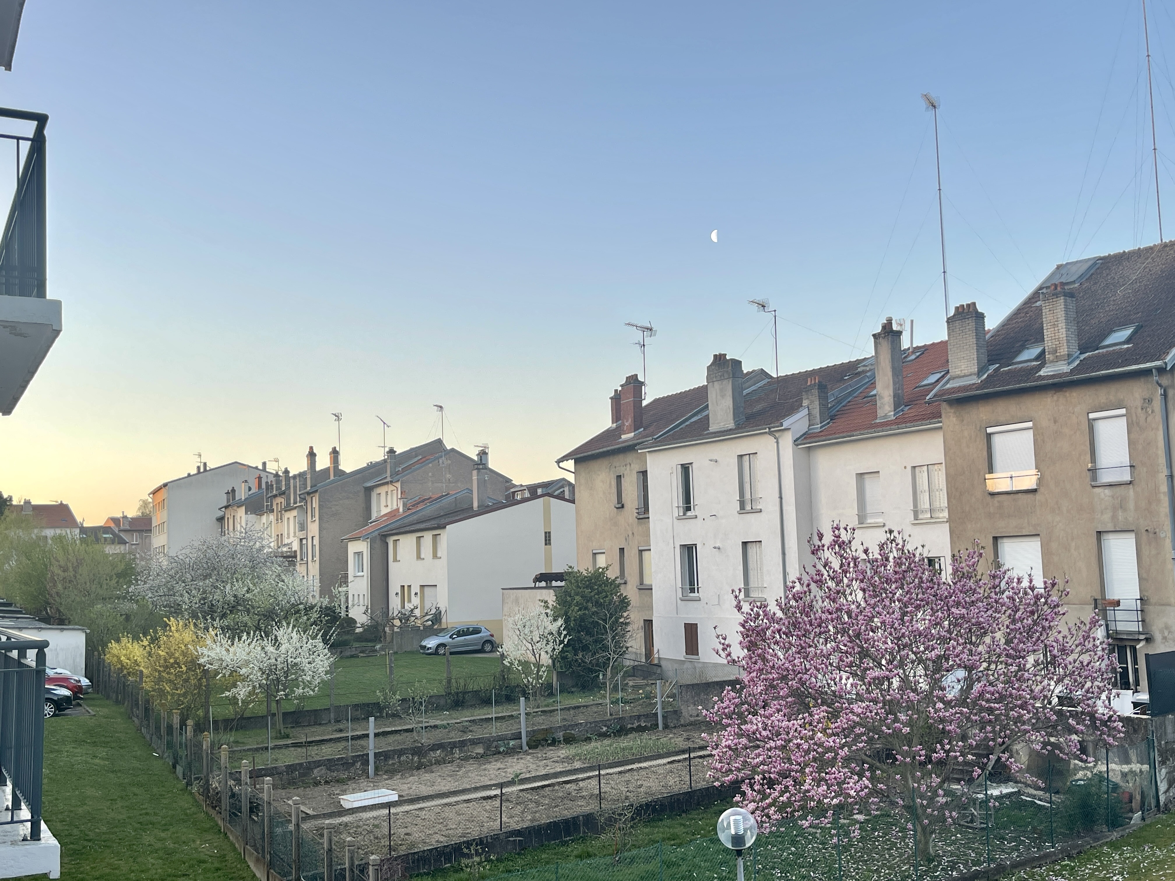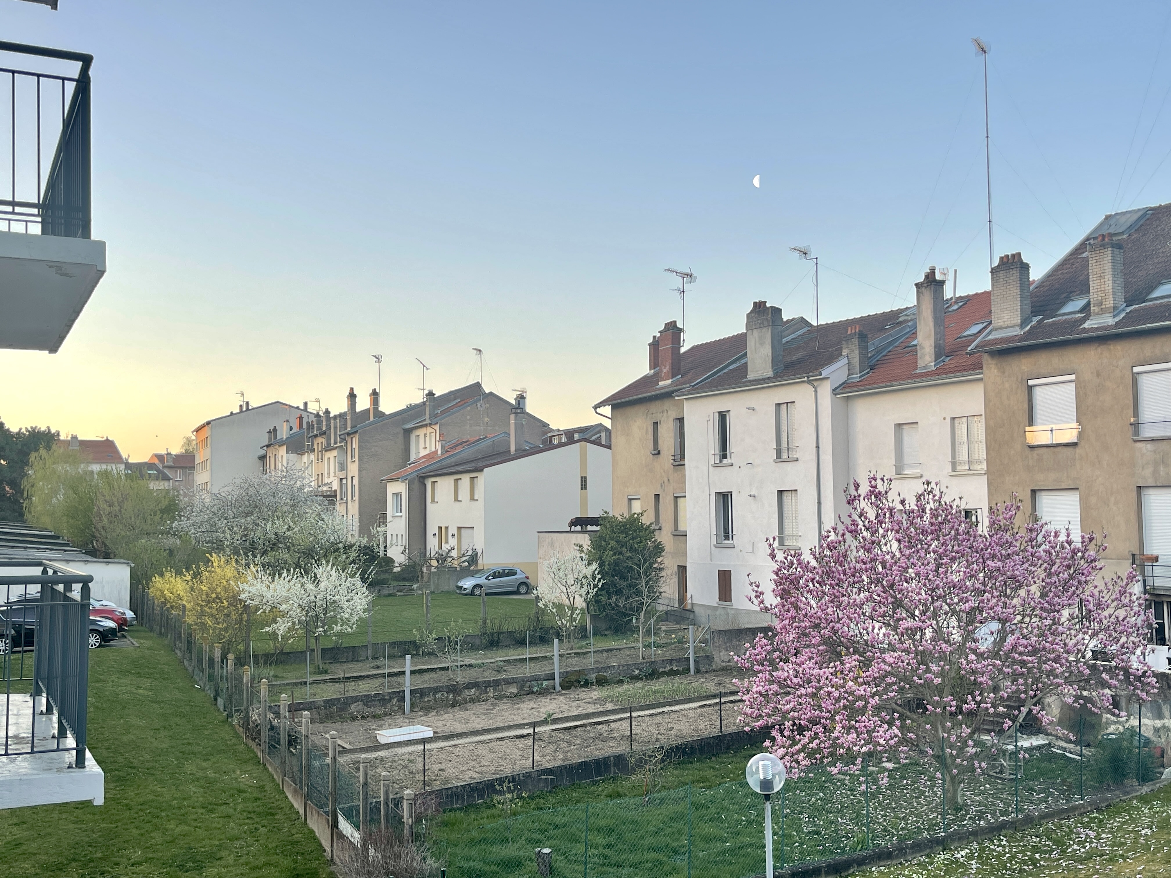 목련과 개나리가 핀 상쾌한 아침 풍경에 반달까지 떠있으니 한폭의 그림같았다!