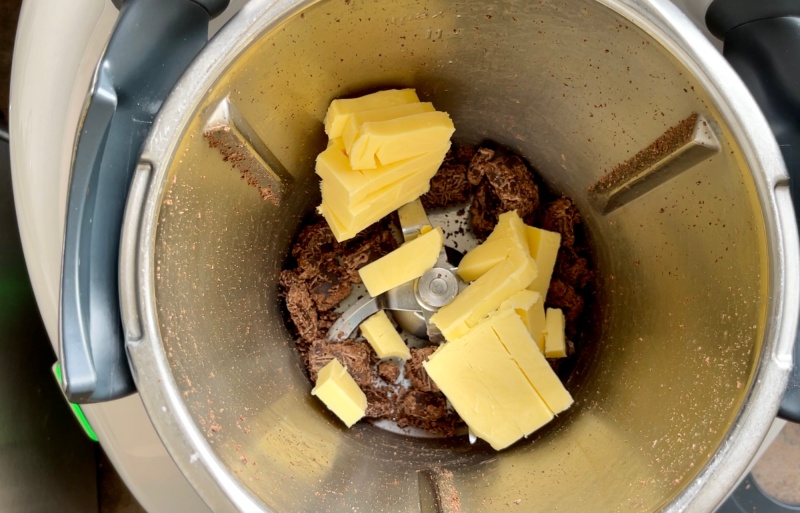 2. 다크 초콜렛을 잘게 조각내고 버터와 함께 녹여준다. (써머믹스로 70도 기준)