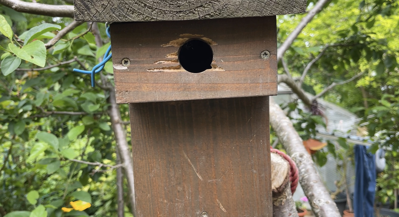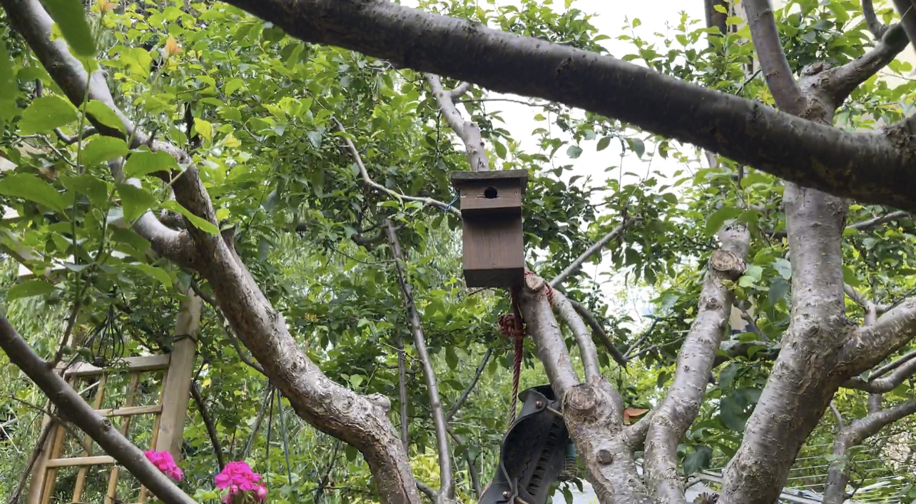 미라벨나무위에 시아버지께서 새집을 매달아 놓으셨는데 어미새가 저곳에 알을 낳고 부화까지 한 것이다!!