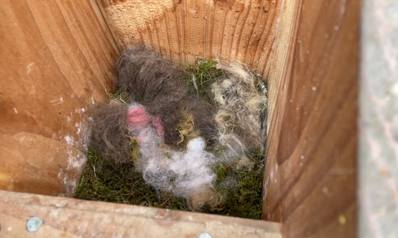 "새집을 살짝 열어보니 새끼들이 6마리가 있더라구. 내가 장미덩쿨에 얹어둔 모웬의 털을 잔뜩 깔아놨지뭐니. 내가 말했지? 새들이 집 지을때 요긴할거라구..."