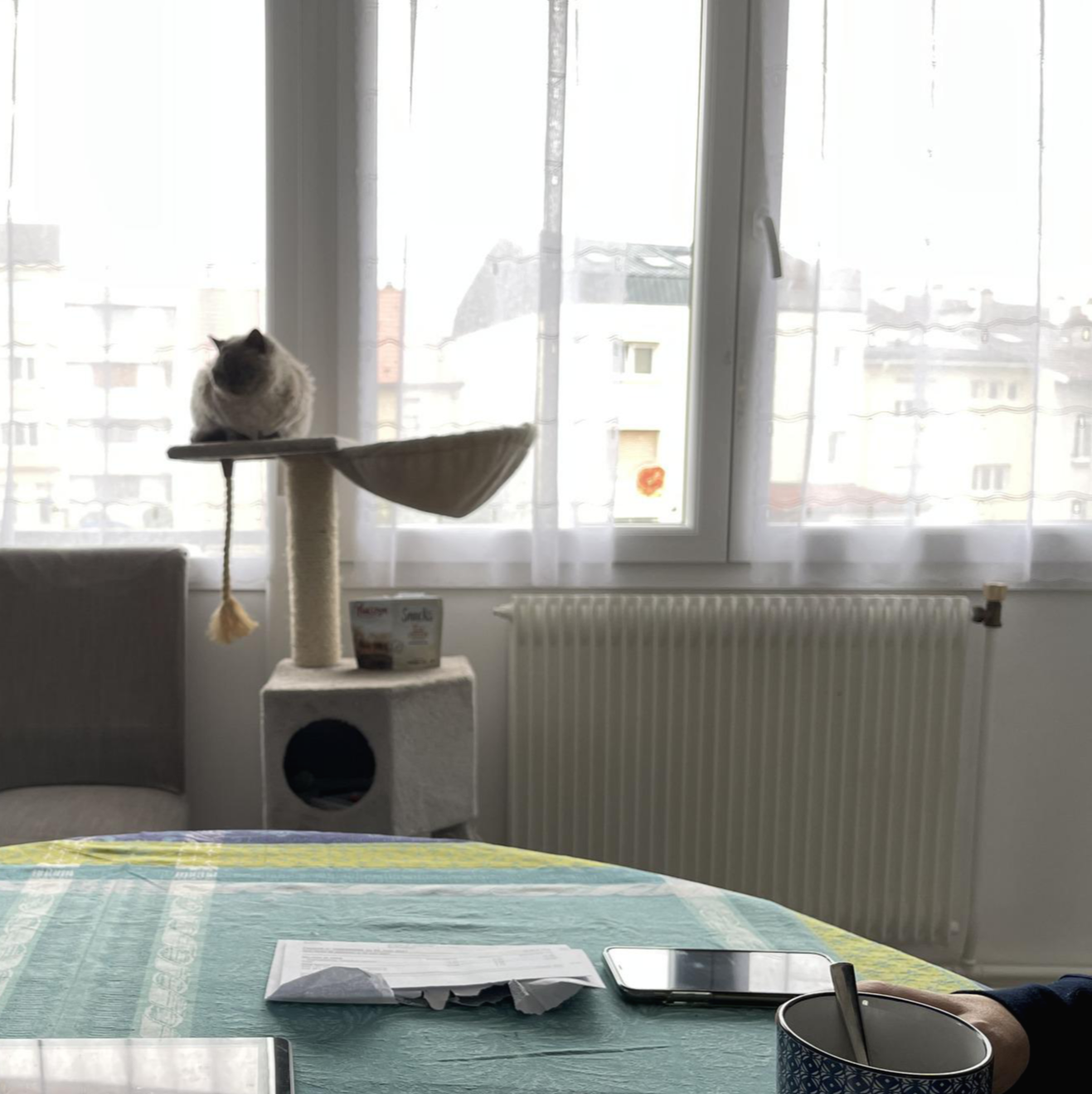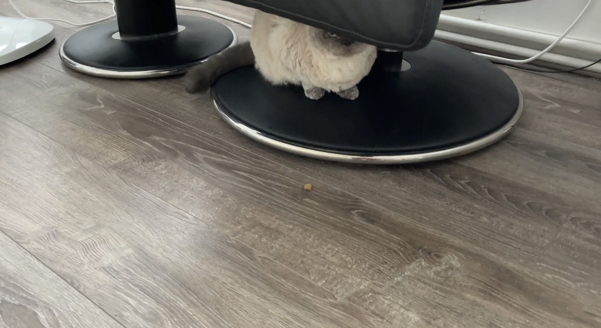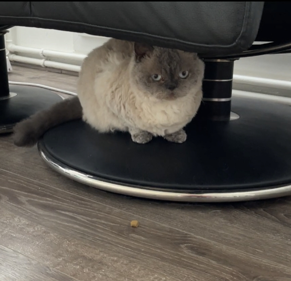 그때 시어머니께서 ㅋㅋ 무스카델 입에 들어갔다가 떨어진 간식을 장난으로 낚아채셨다. (무스카델이 씹는게 서툰지 한번에 잘 못먹고 입밖으로 떨어지는 경우가 종종있다.) 그 바람에 무스카델이 화들짝 놀라 달아나더니 소파밑으로 숨어버렸다.