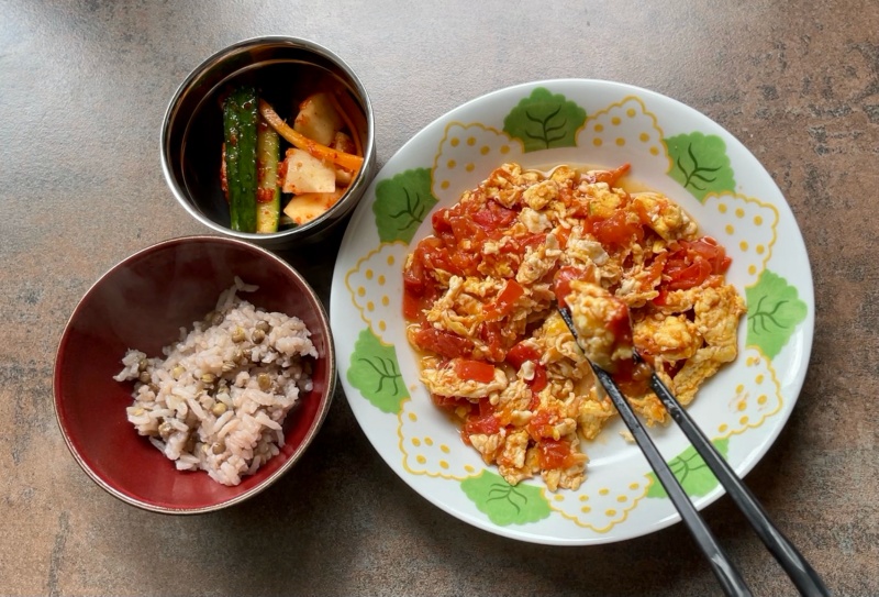 시어머니께서 주신 토마토중에 큰것들은 데쳐서 올리브오일+소금 뿌려서 샐러드로 아주 맛있게 먹어 치웠다. 그리고 작은 토마토로는 마침 나연나경맘님께서 댓글로 추천해 주신(감사합니다!!) 중국식 계란토마토 볶음을 시도해 보기로 했다.