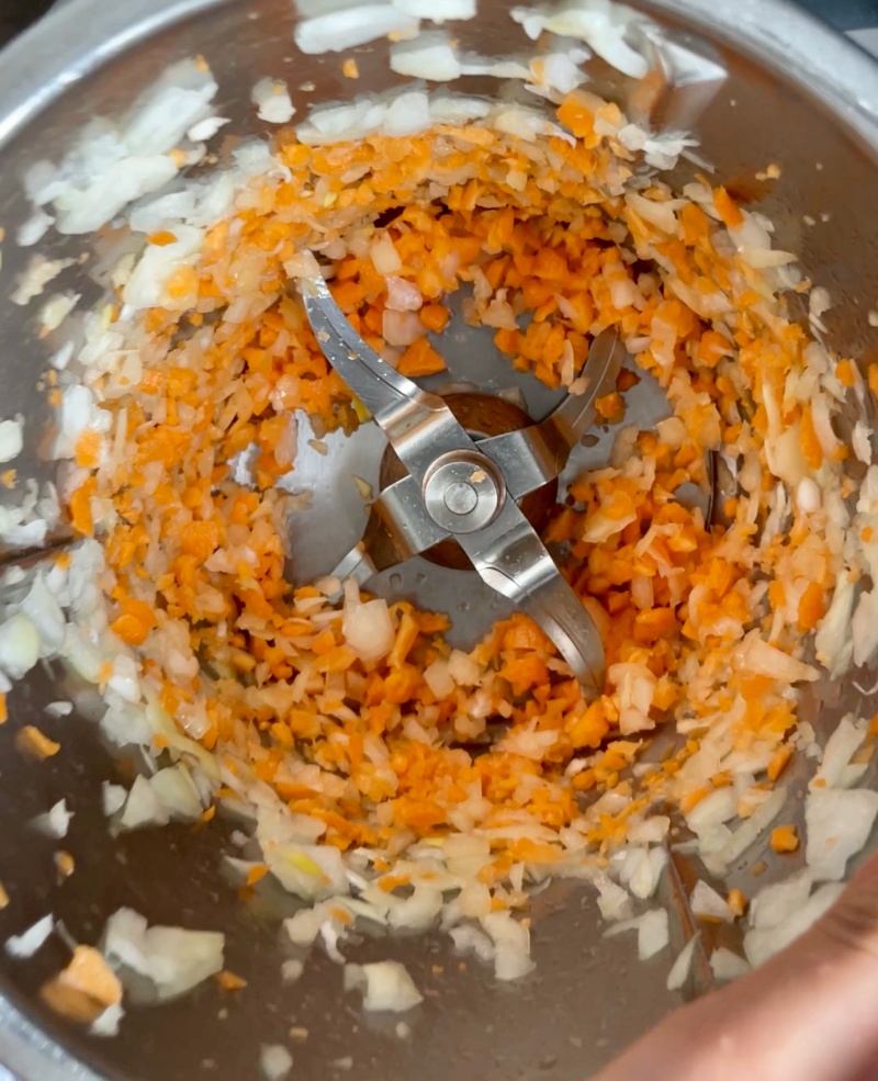 야채들은 써머믹스로 간편하게 다졌고 기름 두른 팬에다 볶았다.