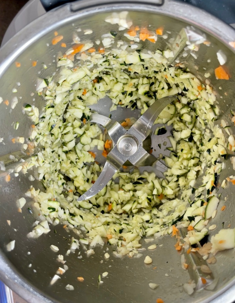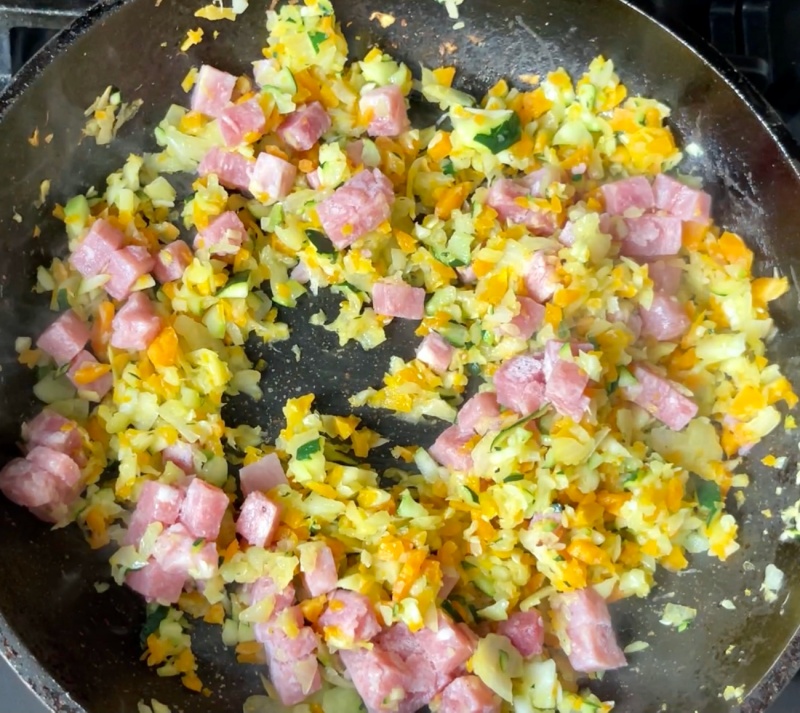 야채들은 써머믹스로 간편하게 다졌고 기름 두른 팬에다 볶았다.