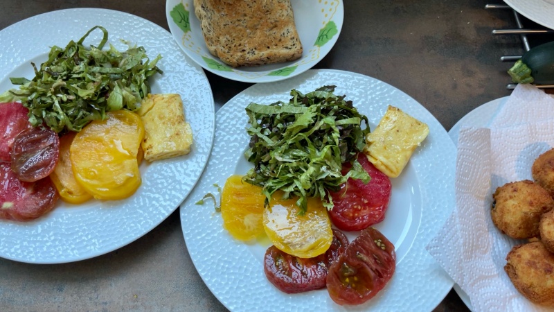 남은 계란물은 부쳐서 남편과 반씩 나눴다. 시댁에서 얻어온 토마토와 샐러드!