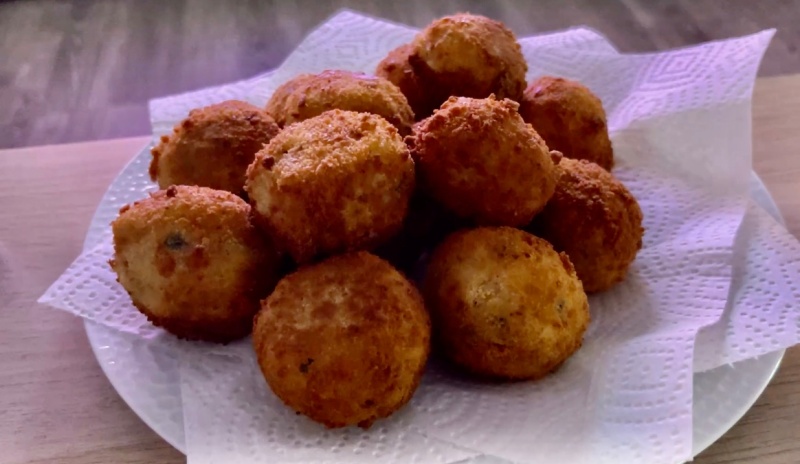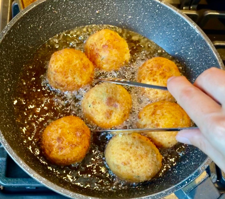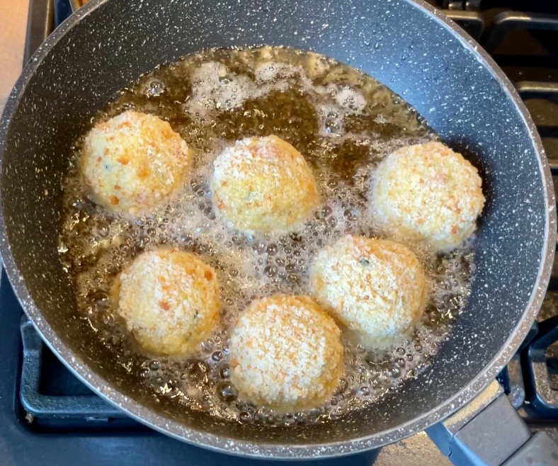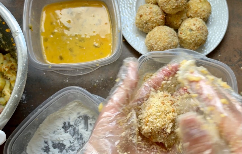 하다보니 요령이 생겨서 속도가 붙었다. 모양은 처음부터 꼼꼼히 잡아줄 필요가 없었다. 계란물도 한쪽에만 풍덩 담근후 비닐장갑낀 양손으로 이쪽저쪽 왔다갔다 던져주니 과하지 않게 적당량으로 표현전체로 계란물이 뭍었고 마지막으로 빵가루를 입혀준 후 한번 더 양손으로 번갈아가며 던져주니 동그랗고 예쁘게 모양이 자동으로 잡혔다. 빵가루도 단단히 고정되고-