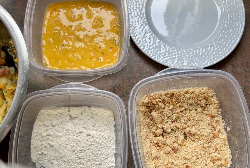 으깬 아채 감자를 적당히 떼어다 동그랗게 모양 내 준 후에 밀가루- 계란물- 그리고 문제의(?) 수제 빵가루 순서로 옷을 입혀주었다.