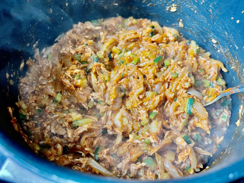 양파와 야채는 잘게 썰어서 기름에 충분히 볶아 주다가 참치 (나는 기름까지 다 붓는다.)와 참기름을 뺀 나머지 양념을 넣고 더 익혀준다음 맛을 봐서 필요한 쌈장이나 고추장을 더 추가한 후 마지막에 참기름을 둘러주면 끝-