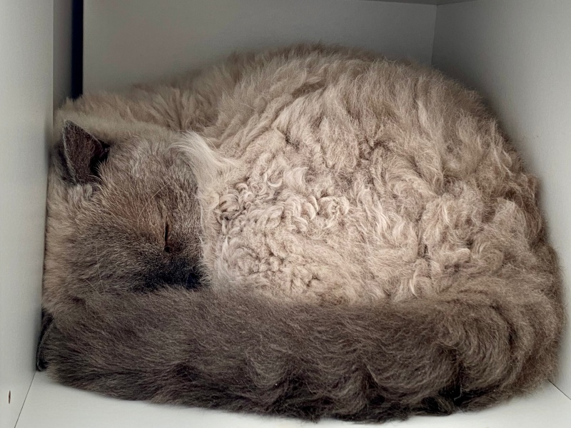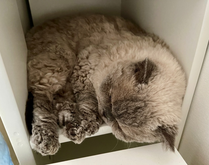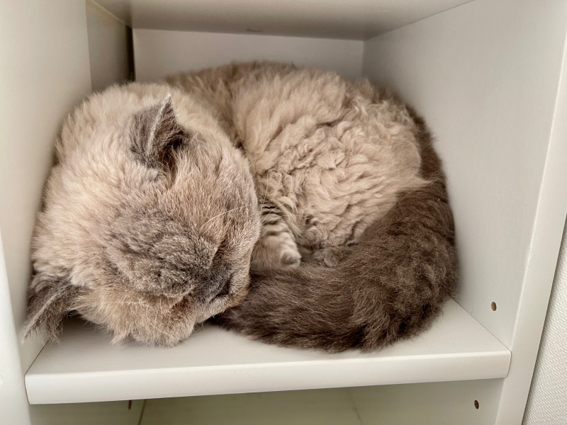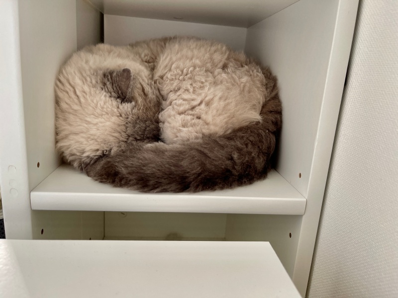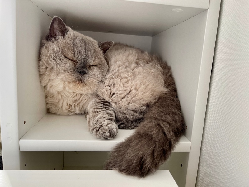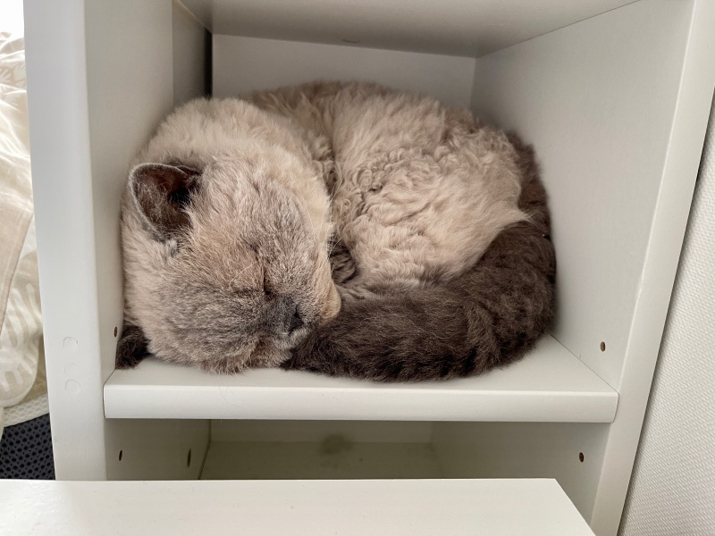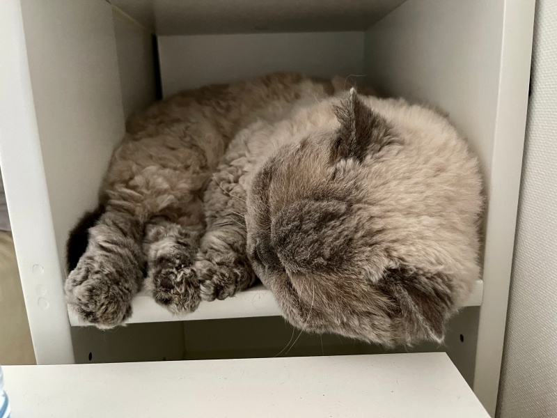 다른 고양이들은 상자를 그렇게나 좋아한다던데, 우리 무스카델은 상자에는 반응이 없다. 그래도 이 조그만 선반자리를 좋아하는걸 보니 고양이는 고양인가보다.