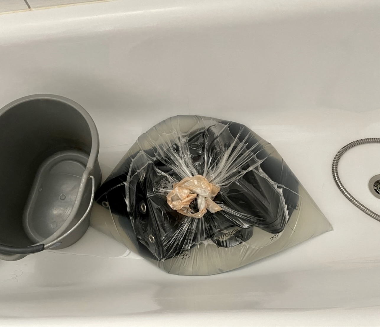 세탁기에 바로 돌릴까 하다가 좀 불리고 싶은데 양동이도 너무 작고 결국 쓰레기봉지 큰 데다 뜨거운 물을 담아서 그 속에 세제와 함께 가방을 넣고 꽁꽁 싸맸다. 그리고는 속으로 참 기발한 아이디어였다고 스스로 대견해하다가 사진을 찍어서 거실에 있는 자서방 휴대폰으로 보냈다. 칭찬해달라고 ㅡㅡ;
