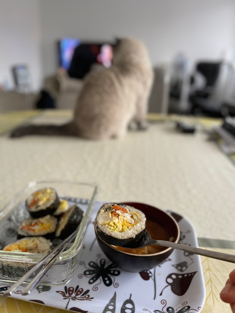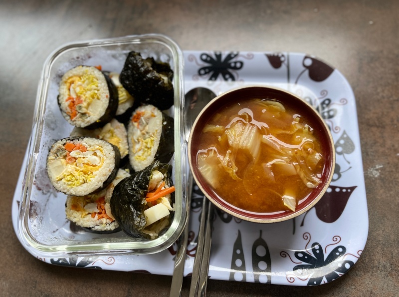 김밥에는 조갯살, 배추 마요네즈 샐러드, 볶은 당근, 무피클, 계란을 넣었다. 뜨거운 국물에 한번 적셔서 먹으니 세상 든든한 아침 식사가 되었다.