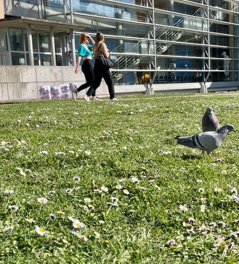 겁없이 옆에 돌아다니는 비둘기들과 시원한 한여름 패션을 뽐내며 옆에 지나가는 여대생들-