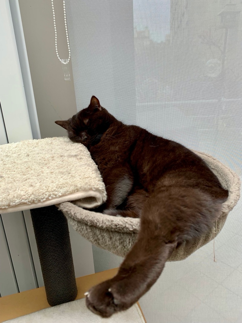무스카델은 꼭 이렇게 한쪽 다리를 꺼내놓고 자곤 한다.