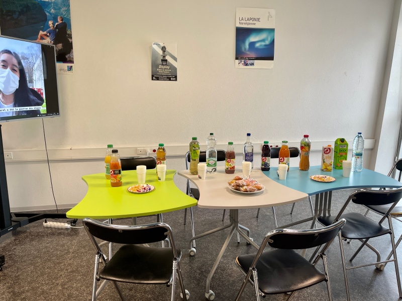각종 음료수며 마들렌과 봉봉이 준비되어 있었다. 그리고 언제 찍었는지 학생들의 인터뷰도 화면에서 나오고 있었는데 우리는 저런거 안찍어서 정말 다행이라며 안도하기도 했다.