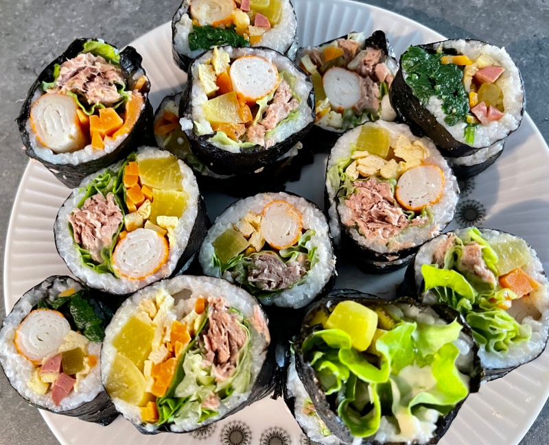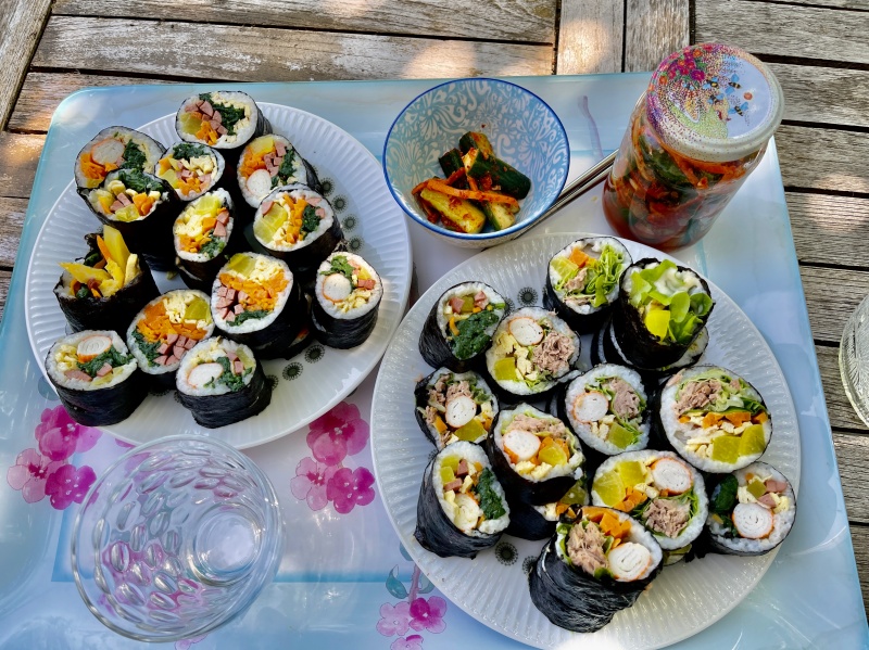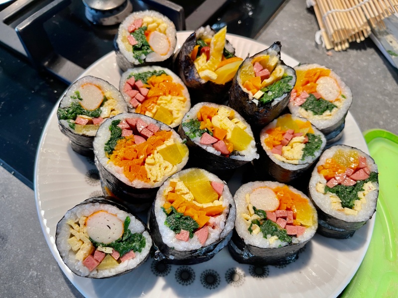 내가 당근을 채썰거나 김밥을 마는 걸 옆에서 일일이 따라하면서 재미있어했는데 막상 본인이 만든 김밥들이 내가 만든 것들에비해 예쁘지 않다며 잠깐 실망하는가 싶더니 맛은 똑같이 좋으니 됐단다ㅋ 우리는 원래 6줄을 싸기로 했었는데 결국 8줄이나 만들었다.