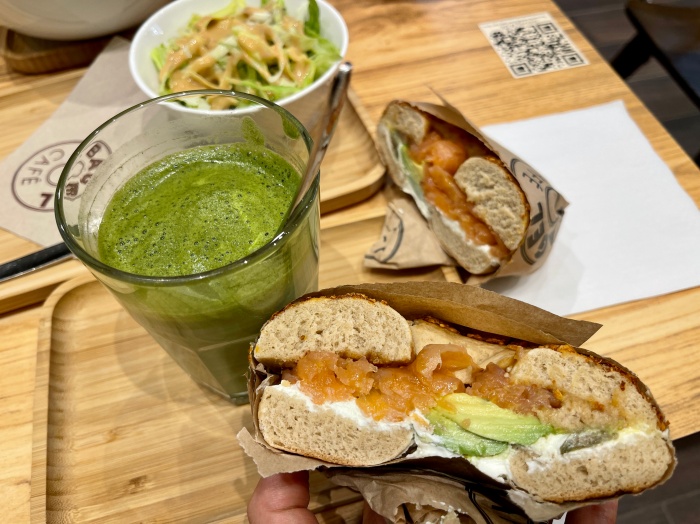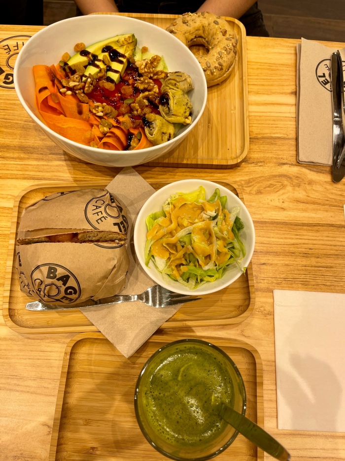 나는 아보카도와 연어가 들어간 베이글을 주문했는데, 샐러드나 칩을 원하냐는 점원의 질문에 내가 괜찮다고 거절했더니, 옆에서 카린이 메뉴에 포함된거라고 알려줘서 뒤늦게 샐러드로 달라고 요청했다. 메뉴에 안나와있길래 추가 주문인줄 알았지...ㅋ