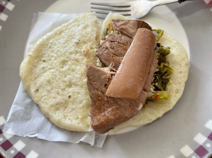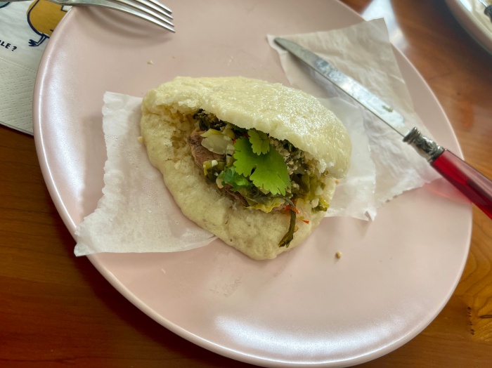 찐빵사이에 머스타드잎, 삶은 돼지고기, 달콤한 땅콩가루등을 넣어서 먹는데 맛의 조화가 정말 좋다. 이번에도 두개씩 먹었다.