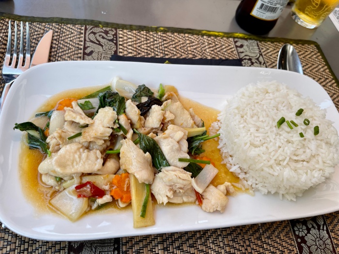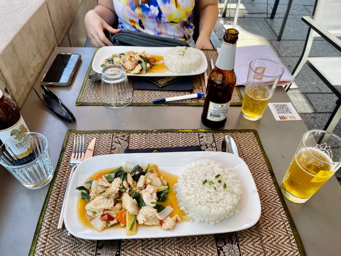 우리는 메인요리와 디저트가 포함된 17유로짜리 세트메뉴로 선택했다. 사실 팟타이가 먹고싶긴 했는데, 팟타이로는 세트메뉴가 안된다고 해서, 둘다 그냥 카이 팟 카 프라오 (매운 닭고기+바질 볶음)로 골랐다. 메뉴옆에 맵다는 표시로 빨간 고추가 3개나 찍혀있었다.