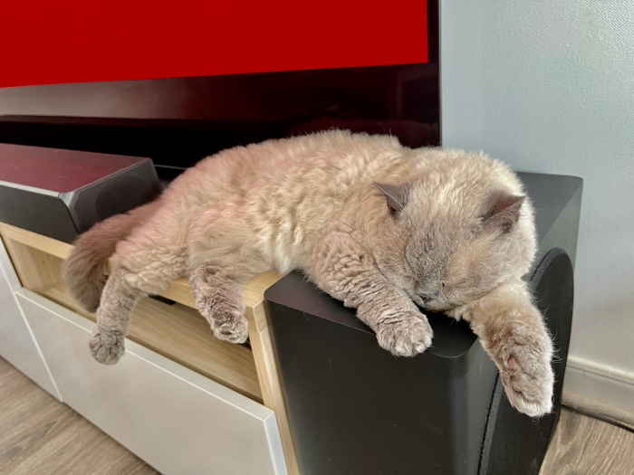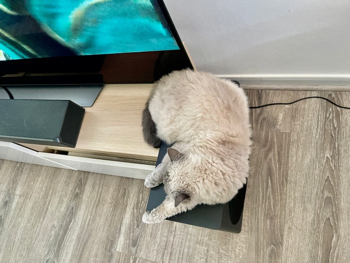 아무튼 티비앞자리를 좋아했는데, 83인치 티비로 바꾸고 나서는 무식이가 앉을 자리가 너무 좁아져버렸다.