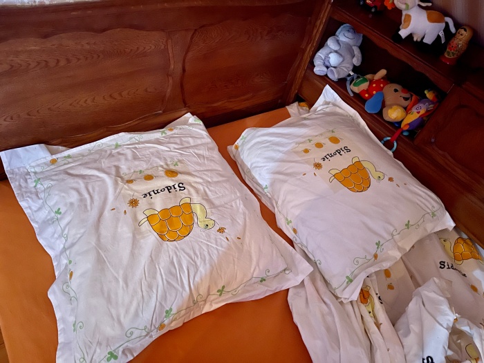 프랑스는 이렇게 정사각형의 베개를 쓴다. 자서방이나 시댁에서는 한국처럼 길쭉한 베개를 써서 한동안 잊고 살았는데, 이거 꽤 불편하다. 베개머리위가 쓸데없이 길어서 침대밖으로 발이 튀어나올 지경이었다.