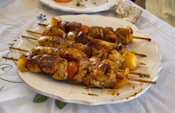 샐러드를 먹고 있을때 고모님께서 닭꼬치구이를 내오셨다.
