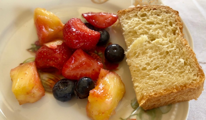 디저트는 딸기, 파인애플, 블루베리가 섞인 과일믹스와 직접 구우신 달콤한 브리오슈였다.