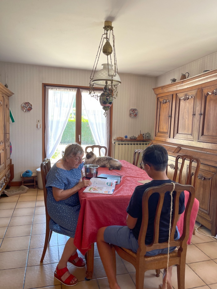 배부르게 식사를 끝낸 후 우리는 다같이 거실 소파에 늘어졌는데 가브리엘은 고모님과 함께 방학숙제를 시작했다. 식탁보가 걷히고 테이블은 이제 책상으로 바뀐 것이다.