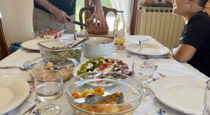 샐러드를 먹고 있을때 아버님께서 빵을 자르기 위해 일어나셨다.