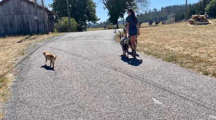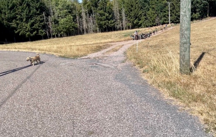 이탈하는 염소가 없도록 주변을 바쁘게 뛰어다니는 기특한 강아지!
