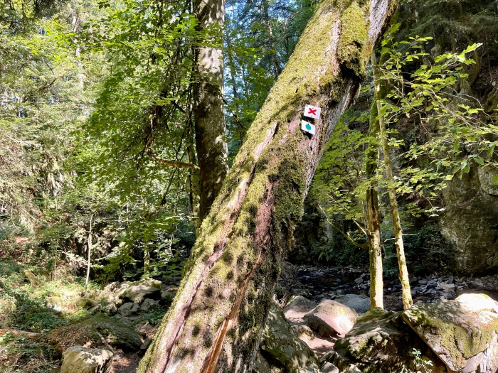 빨간 엑스, 초록 원, 검은 네모 등등.. 우리는 빨간 원을 따라갔다. 작은 폭포에서 큰 폭포로 향해가는 여정이었다. 7.5킬로... 안쉬고 걸으면 2시간 반이라지만...