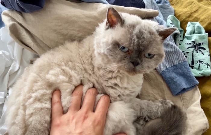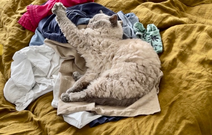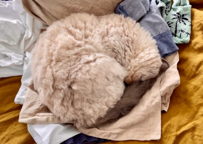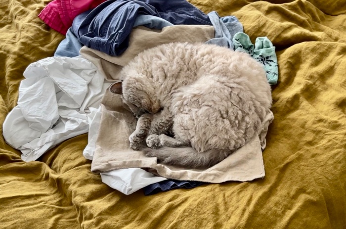 무스카델이 어느새 깨끗한 빨래위에서 자는척을 하고 있었다!!