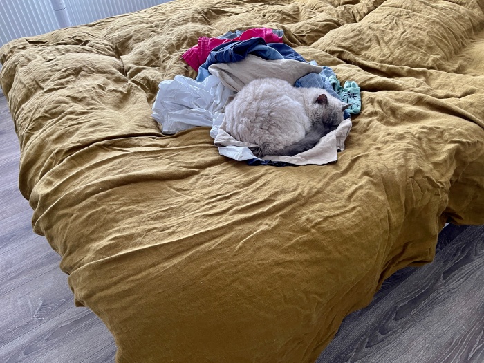건조대에서 마른 빨래를 걷어서 침대위에 잠시 던져놓았다.