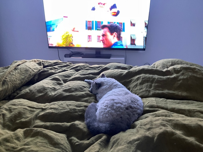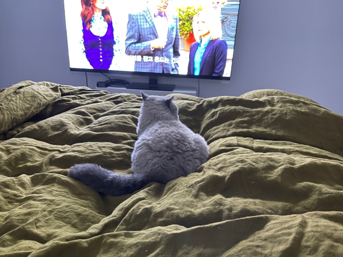 이불이 포근해지니 무식이도 좋은가보다. 밤에는 내 다리옆에 엉덩이를 붙이고 같이 티비를 봤다.