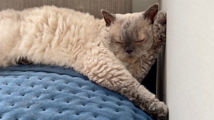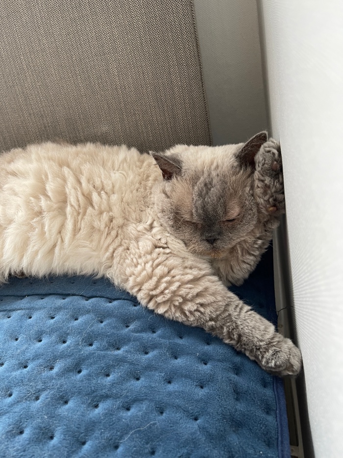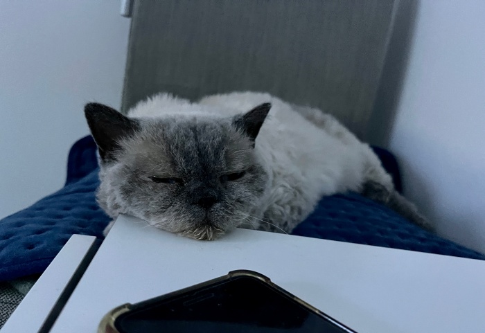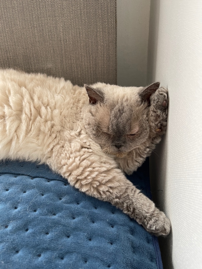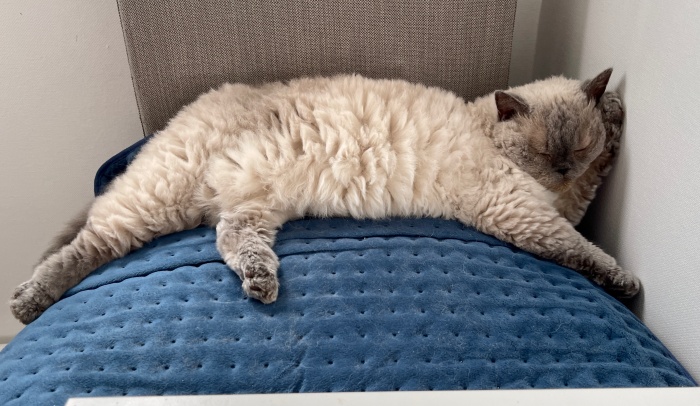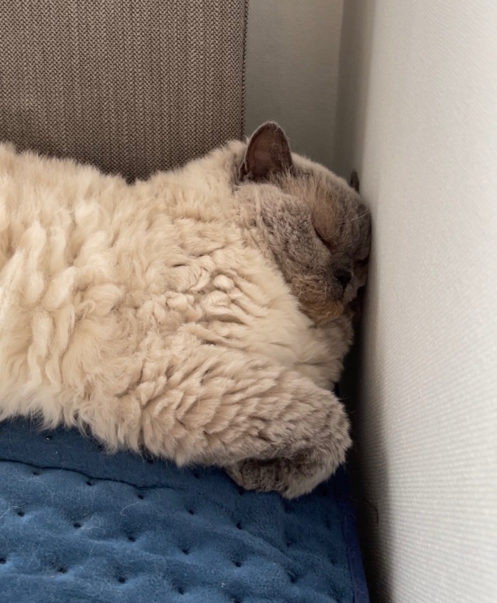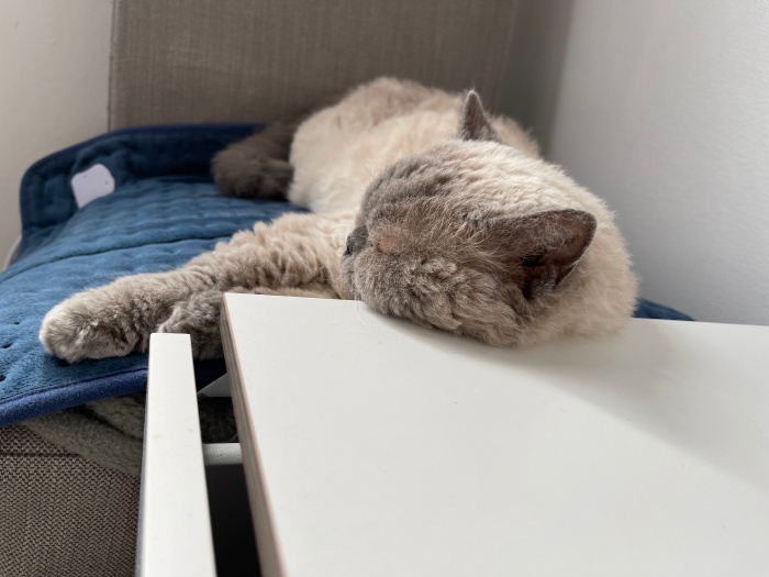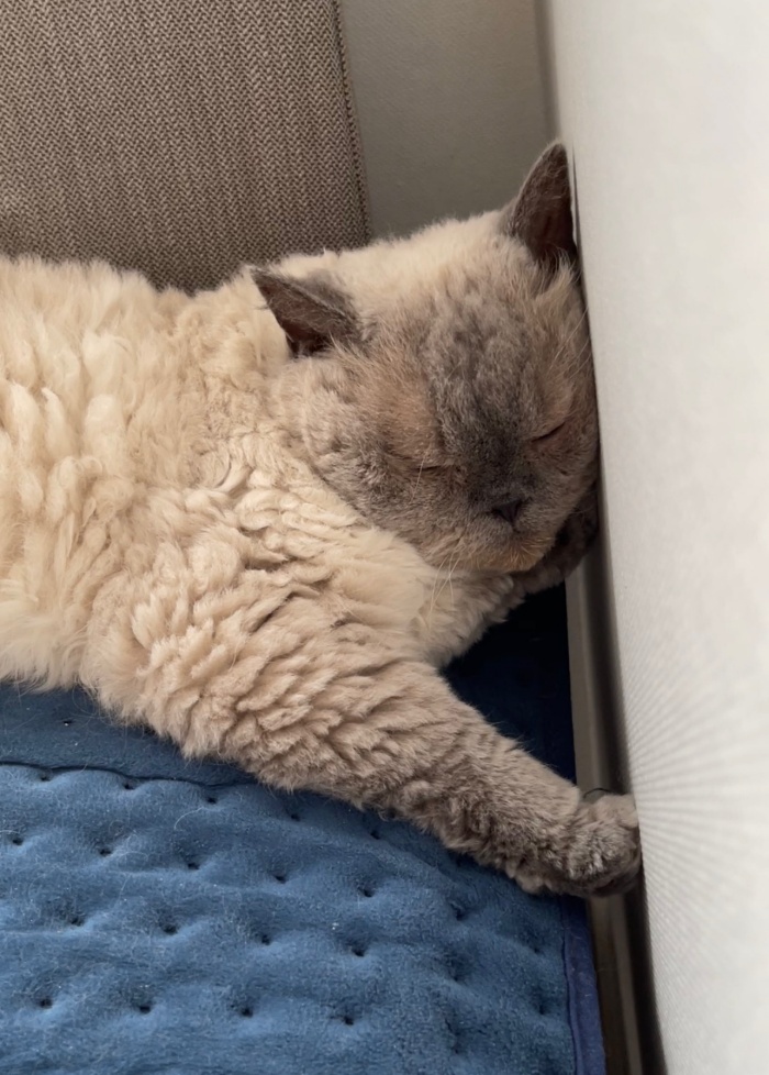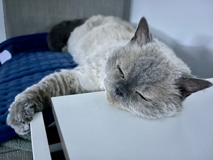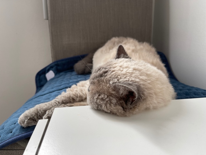 내가 침대에서 티비를 보는 동안 무스카델은 침대옆 의자위에 퍼져서 잠이 들었다.