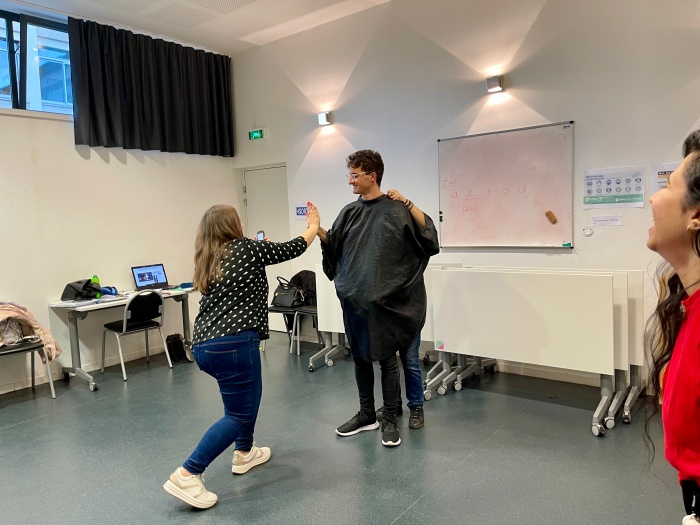 저 남학생뒤에는 또다른 친구가 숨어있는데, 팔만 꿰고 있다가 선생님께서 가르쳐주신, 프랑스인들이 자주 사용하는 제스처를 취하면 앞에 서있는 남학생이 거기에 맞춰서 즉흥적으로 대사를 말한다. 센스만점인 저 헝가리 남학생덕분에 많이 웃었다.