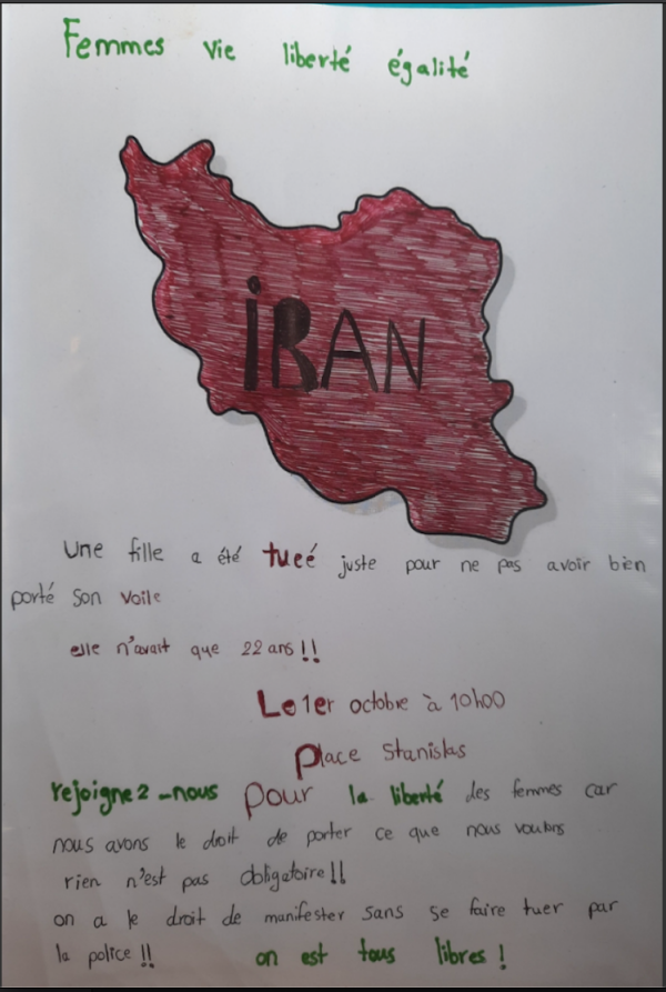 한편, 이 친구의 반대편 옆에서는 이란 친구가 히잡을 반대하는 주제로 전단지를 만들고 있었다.