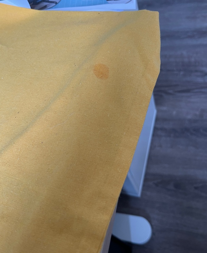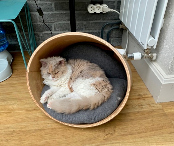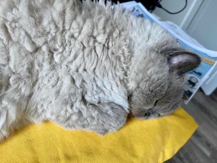 무스카델이 누워자고 있는 저 노란천은 내가 며칠전 학교에서 장관과의 회의후에 받아온 선물 상자에 들어있던 천가방이다.