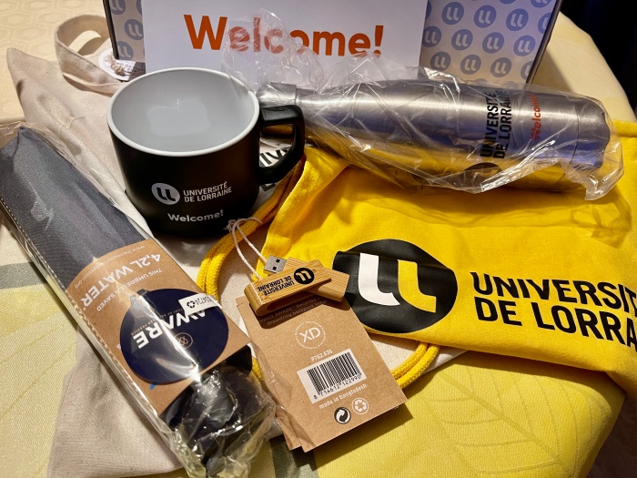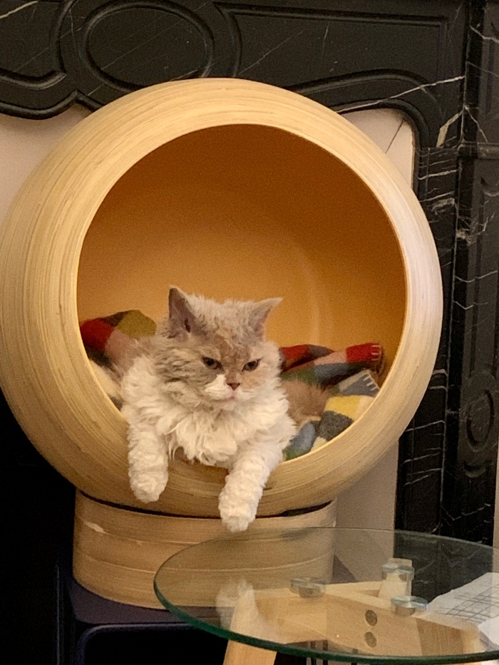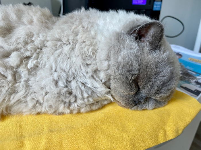 무스카델이 누워자고 있는 저 노란천은 내가 며칠전 학교에서 장관과의 회의후에 받아온 선물 상자에 들어있던 천가방이다.
