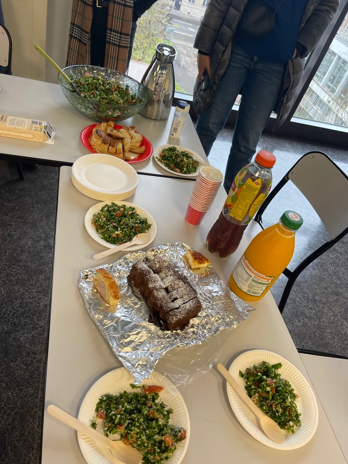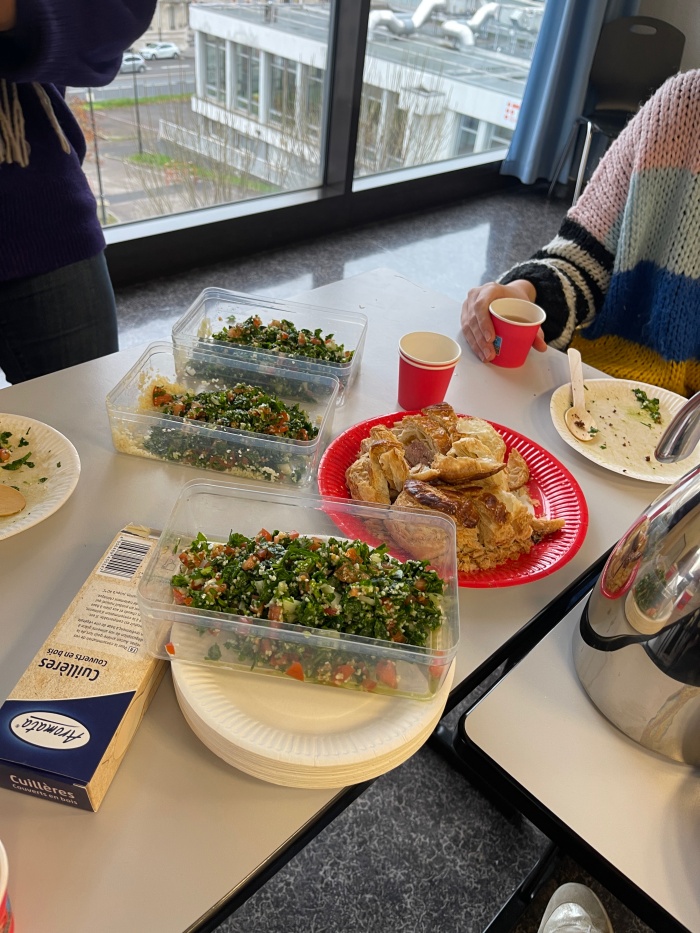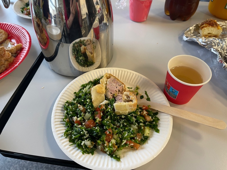 선생님이 뜨거운 차를 갖다 주셨다. 신선한 타불레, 빠떼로렌 (pâté lorraine), 갸또오쇼콜라, 쥬스- 이만하면 풍성하다!