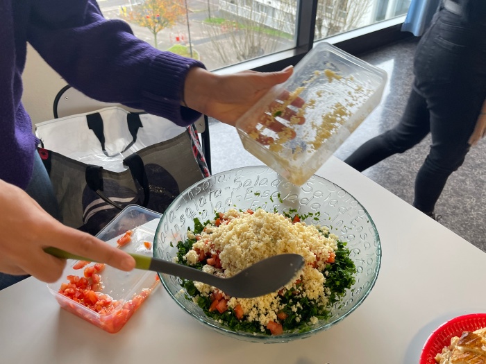 시리아 친구는 강의실에 들어가자마자 쇼핑백에서 음식 재료를 꺼내기 시작했는데 그 재료들이 끝없이 계속 나왔다. 부엌을 아예 통채로 옮겨온 듯한...